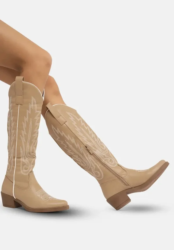 De laarzen hebben een cowboy look, een afgeronde neus, een blokhak van 5 cm, gestikte details en een ritssluiting aan de binnenzijde en zijn verkrijgbaar in 6 kleuren