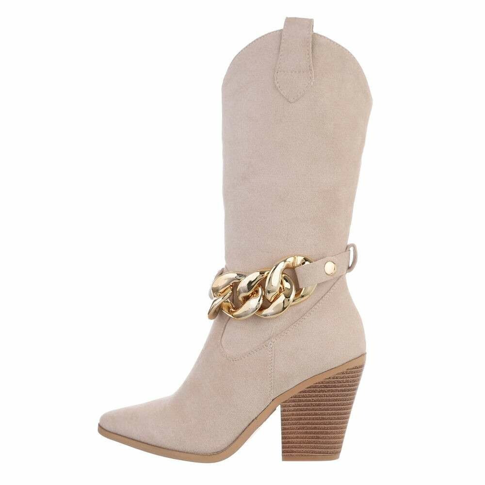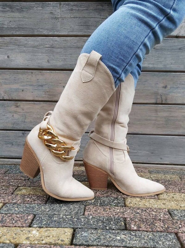 Western boots met goudkleurige schakelketting en hoge blokhak / Stoere City western enkellaars met chaindetail -